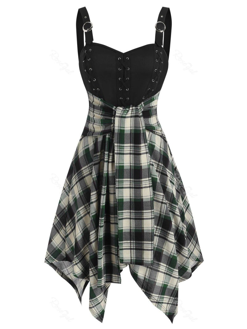 Lace Up Plaid Handkerchief Flare Dress