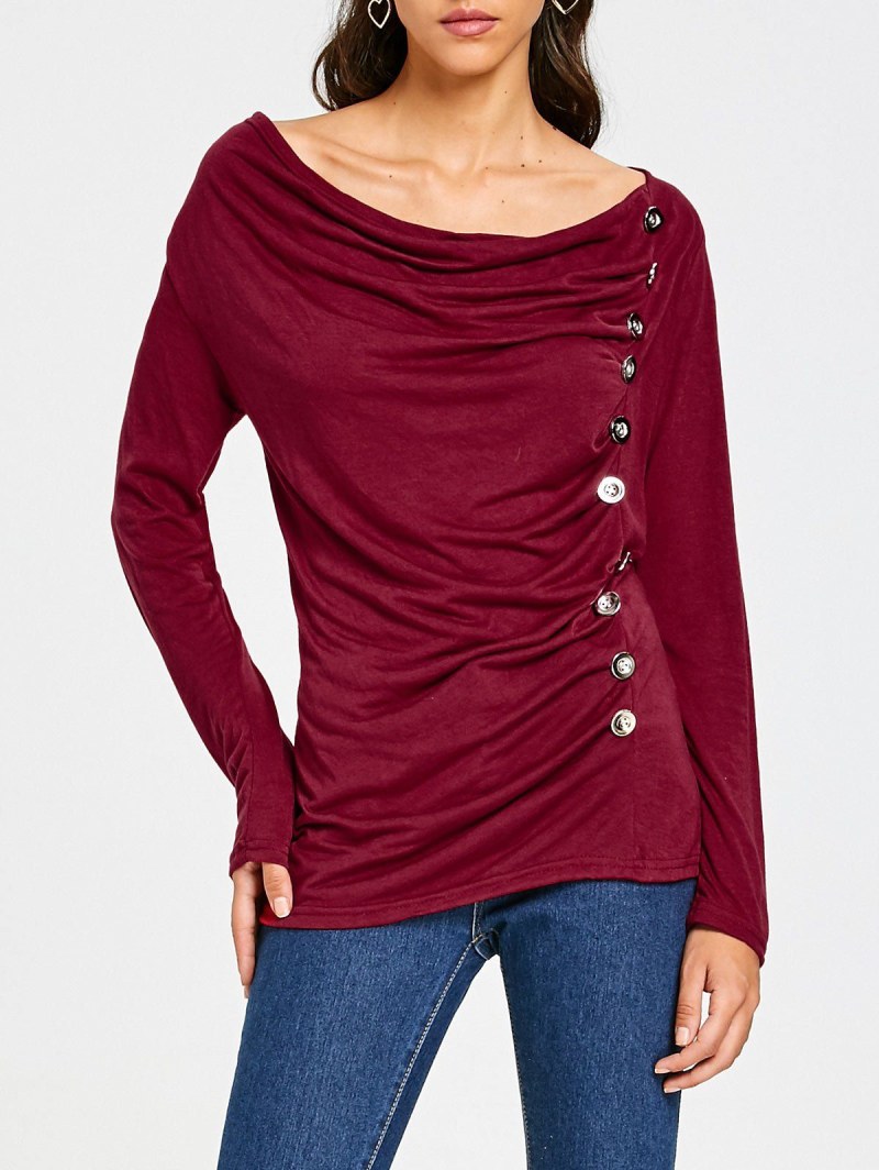 Cowl Neck Long Sleeve Button Embellished Blouse For Women