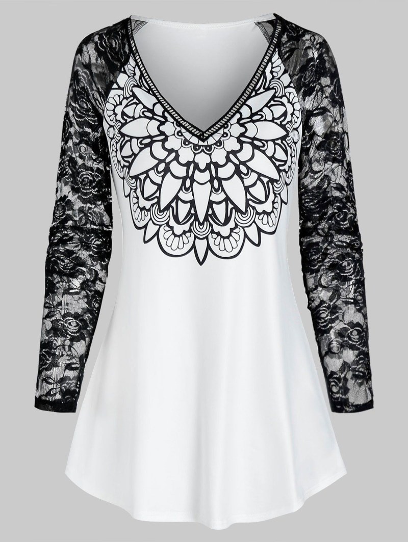 V Neck Printed Lace Raglan Sleeve T Shirt