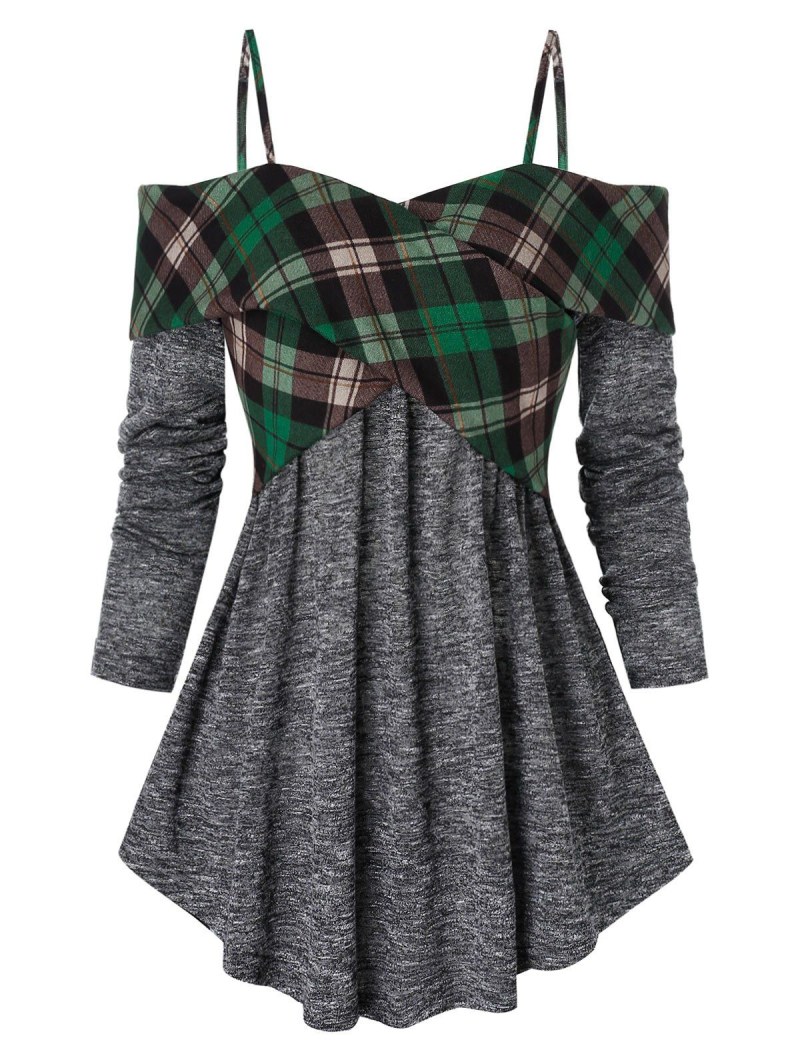 Open Shoulder Plaid Pattern Crisscross Sweater